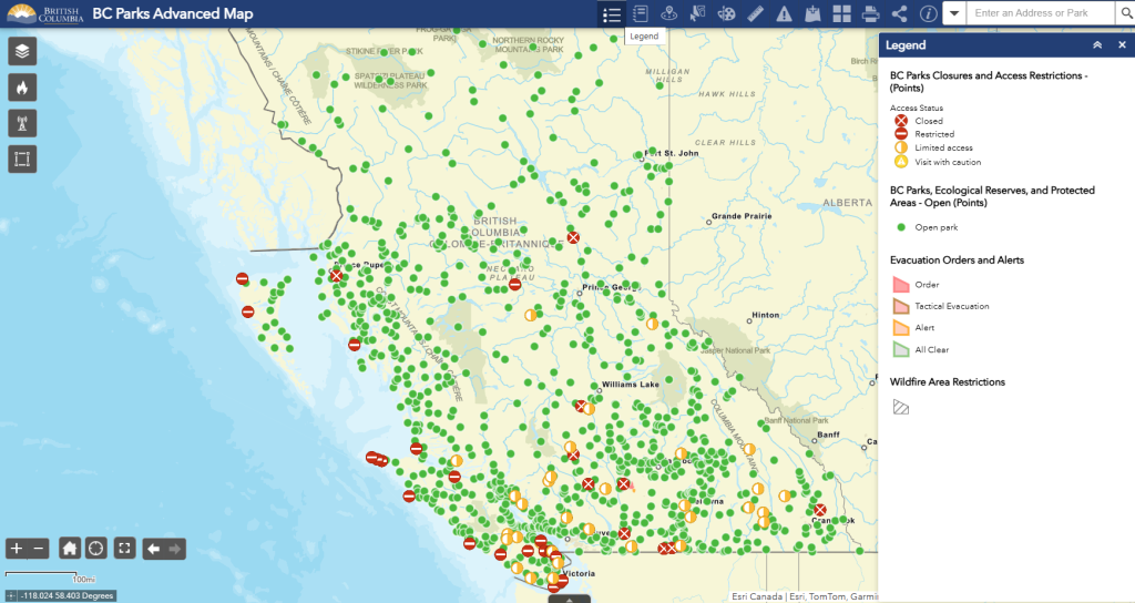 - Wildfire, air quality and road conditions: Emergency and wildfire layers from BC Wildfire Service, BC Air Quality, and DriveBC.